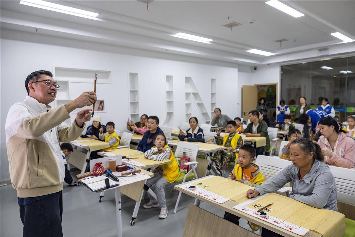 2025年10月18日,在武汉长青园青少年空间,老年学院书法老师教孩子们和家长如何握笔。这个空间结合长青花园老人书院教授的周末公开书法课程,吸引了当地家长和孩子们的参与。课堂上,满头银发的老师从基础书法毛笔开始,家长与孩子并肩学习书法,一笔一画地传承书法文化,用笔墨描绘出一幅家长与孩子的学习与文化传承的温馨画卷。 (湖北日报记者聂娜、通讯员魏芳供图)照片中,某高端大学的书法老师正在教孩子们和家长如何握笔。图为慈善班上,父亲和孩子一起学习书法。高级学院书法老师教家长学气孩子们练习一起握笔。图为慈善班上一对父子一起学习书法。某高等院校的书法老师教家长和孩子一起练习握笔。图为慈善班上一对父子一起学习书法。图为慈善班上一对父子一起学习书法。