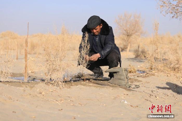 中新社新疆麦盖提11月27日电 (任鹏程 陈文军 艾斯克尔·赛麦提)塔克拉玛干沙漠的冬季异常寒冷。近日,护林员阿不都木门·伊民一早在新疆维吾尔自治区麦盖提县沙海林场的林道上开始了日常巡逻工作。