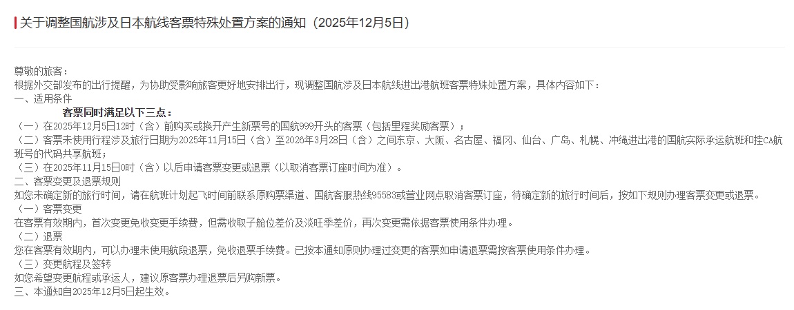 今日,国航、东航、南航等航空公司再次发布关于调整日本航线相关特价机票供应计划的通知。符合条件的机票是指2025年12月5日(含)中午之前购买或兑换的符合资格的机票,以及旅行日期为2025年11月15日(含)至2026年3月28日(含)期间的未使用机票,并且包括日本境内的往返航班(含中途停留)或代码共享航班。您可以免费取消或更改预订。国航客票的资格条件须同时满足以下三个条件: 1. 2025年12月5日12:00之前在999购买或兑换新客票号的国航客票(含里程奖励客票)。 2. 客票未使用的行程包含旅行日期。这些是国航实际承运的航班,与 CA 航班号的代码共享航班从东京、大阪、名古屋、福冈、仙台、广岛、2025年11月15日(含)至2026年3月28日(含) 冲绳县札幌市。 3、2025年11月15日午夜后(根据机票预订取消时间)申请改签或退票。东航条件: 1. 持有东航781客票的国际、地区或国内航班。机票包含至少一个未使用的航班,包括日本境内的出港、出港和转机航班(包括东航或其他航空公司的航班)。航班起飞日期为2025年11月15日(含)至2026年3月28日(含)。同一张机票内其他未使用航段的日期没有限制。 2、客票出票或补开日期:截至2025年12月5日中午。 3、取消行程日期:适用于2025年11月15日(含)至原定出发时间之间取消行程的旅客。此规则不适用于取消行程的旅客很少在航班预定起飞时间之后或 2025 年 11 月 14 日(含)之前。南航条款适用于客票:2025年12月5日(含)12:00前购买或兑换的南航784始发客票,客票未使用的行程包括2025年11月15日(含)至2026年3月28日(含)期间的旅行行程、日本境内单程往返(含中转站)及实际航班或代码共享航班由中国南方航空运营。带有 CZ 航班号的航班。上海航空条款与细则适用于持有 1,781 张机票的国际、地区或国内航班。机票包含至少一个未使用的航班,包括日本境内的出港、出港和联程航班(包括上海航空或其他航空公司的航班)。航班起飞日期为2025年11月15日(含)至2026年3月28日(含)。没有限制同一张机票中其他未使用航段的日期。 2.出票或补开日期:至2025年12月5日中午。 3.取消行程日期:本规定适用于2025年11月15日(含)至原定出发时间之间取消行程的旅客。此规则不适用于在航班预定起飞时间之后或 2025 年 11 月 14 日(含)之前取消行程的乘客。 11月14日,外交部和中国驻日本使领馆郑重敦促中国公民近期避免前往日本。在日华人应密切关注当地安全形势,增强安全意识,加强自卫。多家航空公司15日发布一系列通知,表示12月31日之前出行日期以及日本相关航线的符合条件的机票可以免费退票或改签。