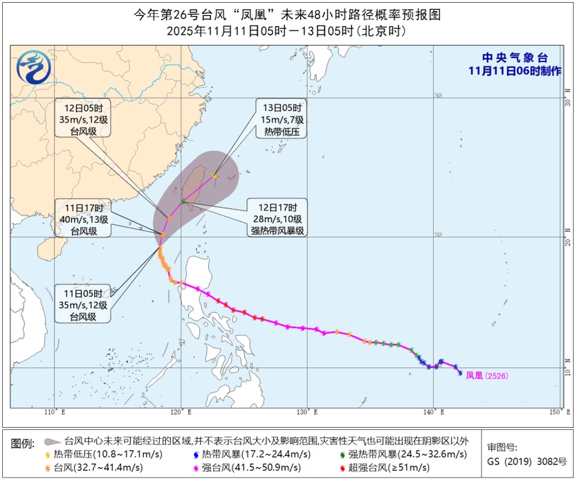 降水预报:上午 8:00 开始11日至上午8点12日h,福建省东南部、台湾岛东部和南部等地预计有大到大雨,台湾岛东北部和东南部预计有大雷阵雨(100~150毫米)。